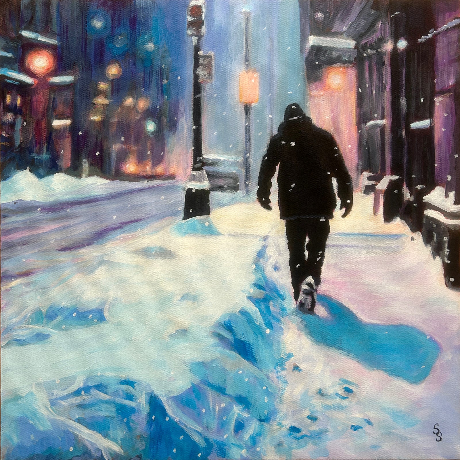 Every city holds a story after dark in the midst of a winter storm, and *Midnight Steps Along Barrington* is my quiet invitation to listen in on one such tale. This piece captures a solitary figure forging their way on a snow-blanketed street: Halifax’s usually bustling urban artery now deserted amidst an impending storm. Can you hear the crunching of the footsteps on the snow?
