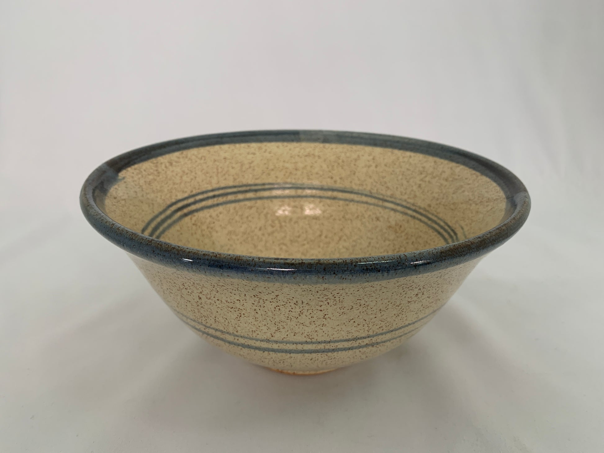 JG751 $80 Bowl - Speckled cream w blue rim 8¾"w x 3¾”h